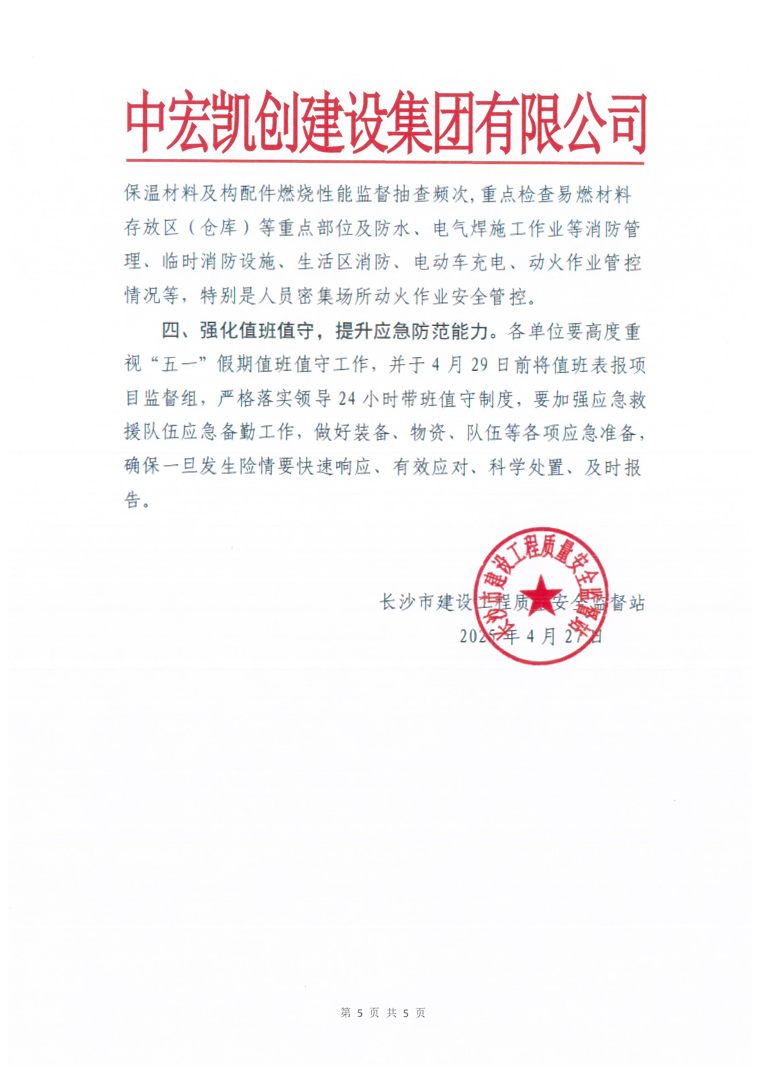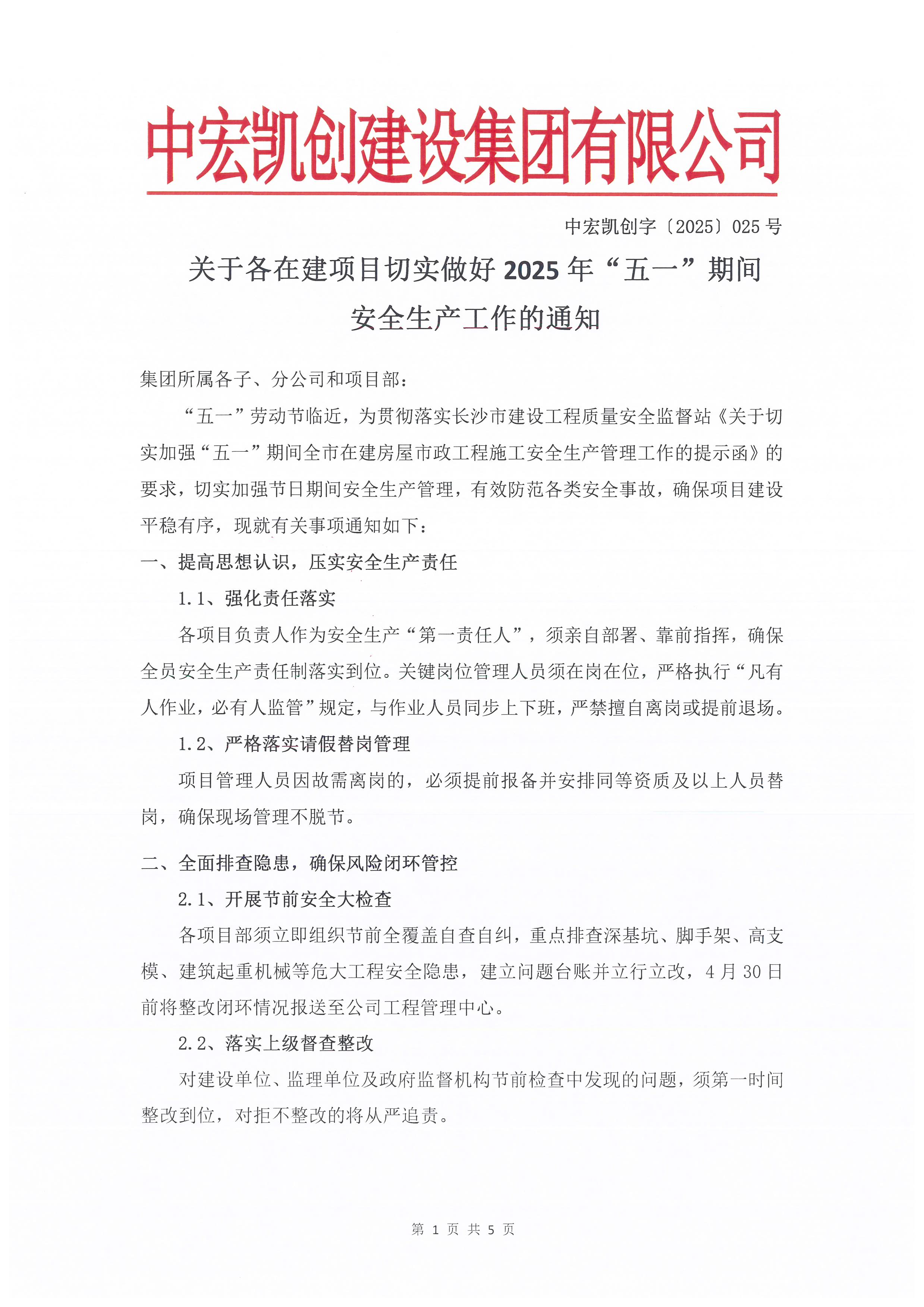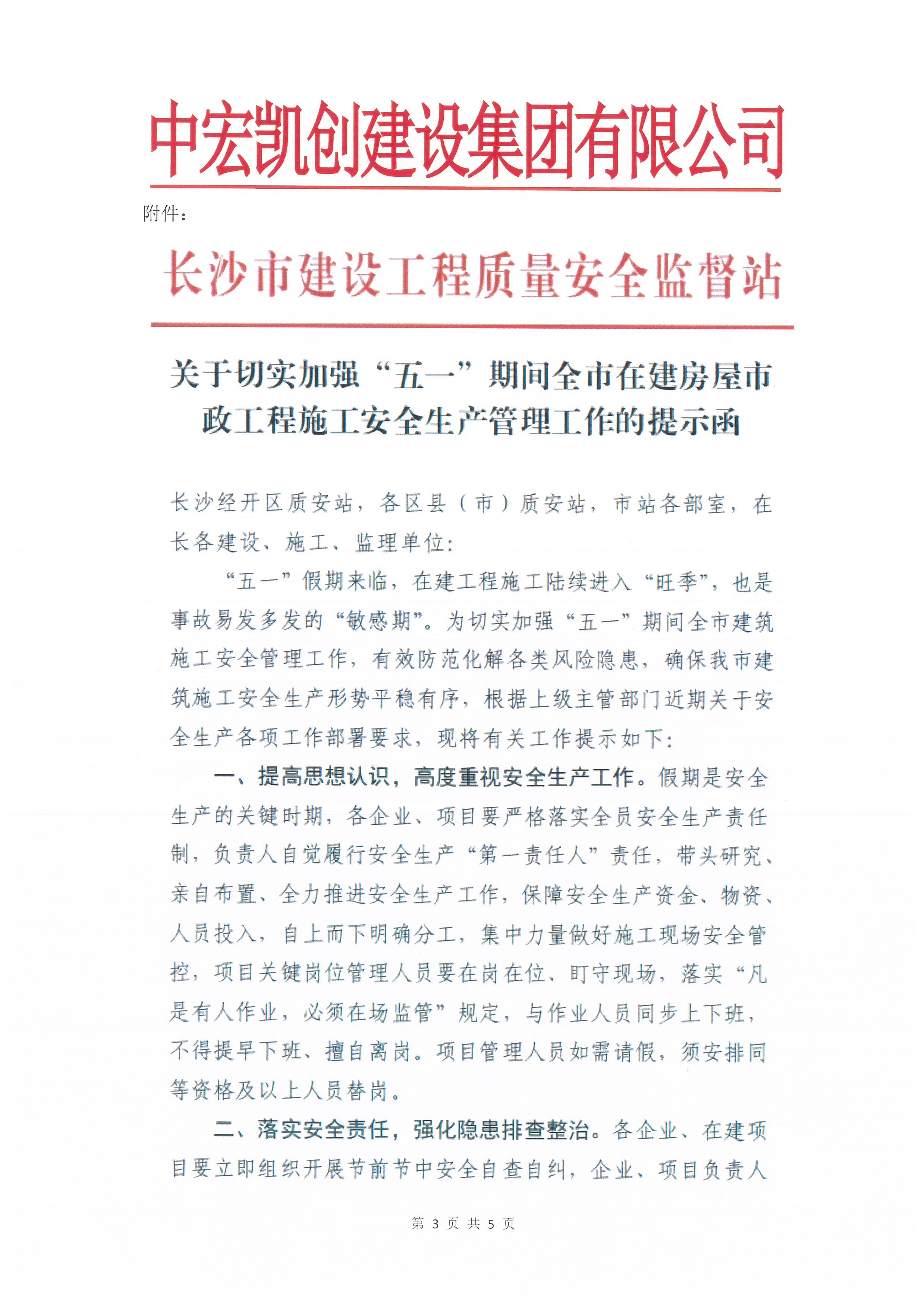 “五一”劳动节临近,为贯彻落实长沙市建设工程质量安全监督站《关于切实加强“五一”期间全市在建房屋市政工程施工安全生产管理工作的提示函》的要求,切实加强节日期间安全生产管理,有效防范各类安全事故,确保项目建设平稳有序,现就有关事项通知如下: