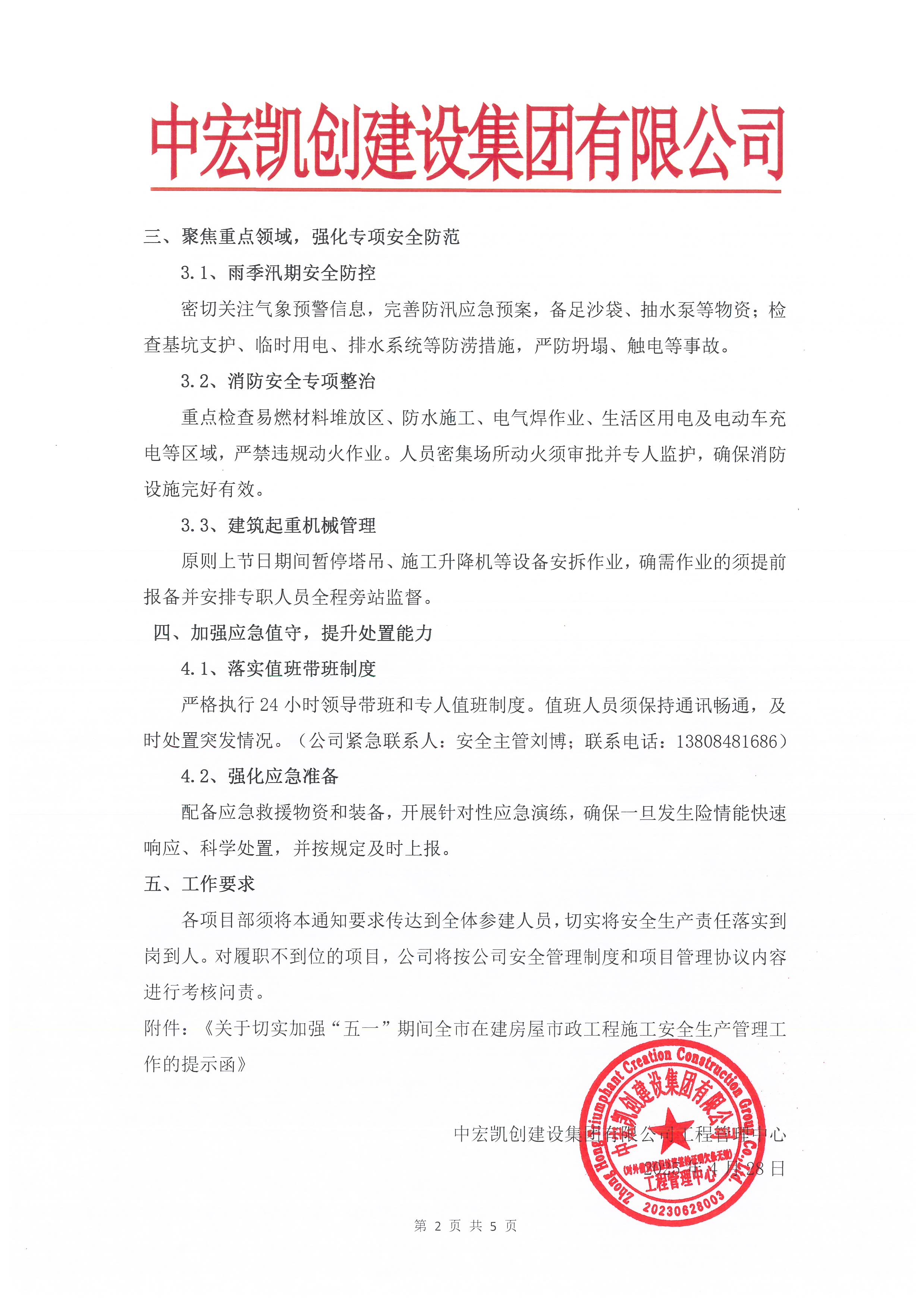 严格执行24小时领导带班和专人值班制度。值班人员须保持通讯畅通,及时处置突发情况。(公司紧急联系人:安全主管刘博;联系电话:13808481686)