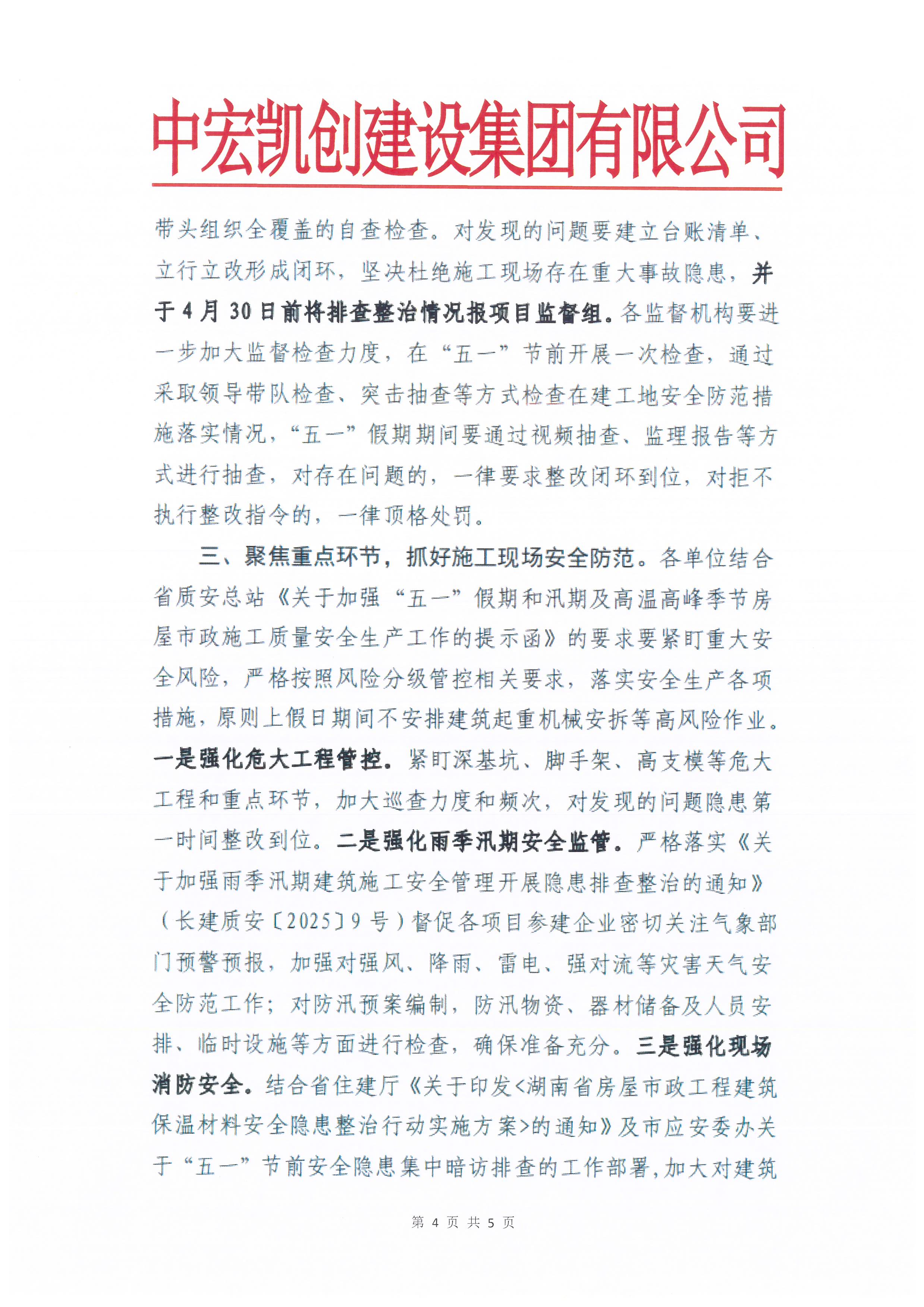 各项目部须立即组织节前全覆盖自查自纠,重点排查深基坑、脚手架、高支模、建筑起重机械等危大工程安全隐患,建立问题台账并立行立改,4月30日前将整改闭环情况报送至公司工程管理中心。