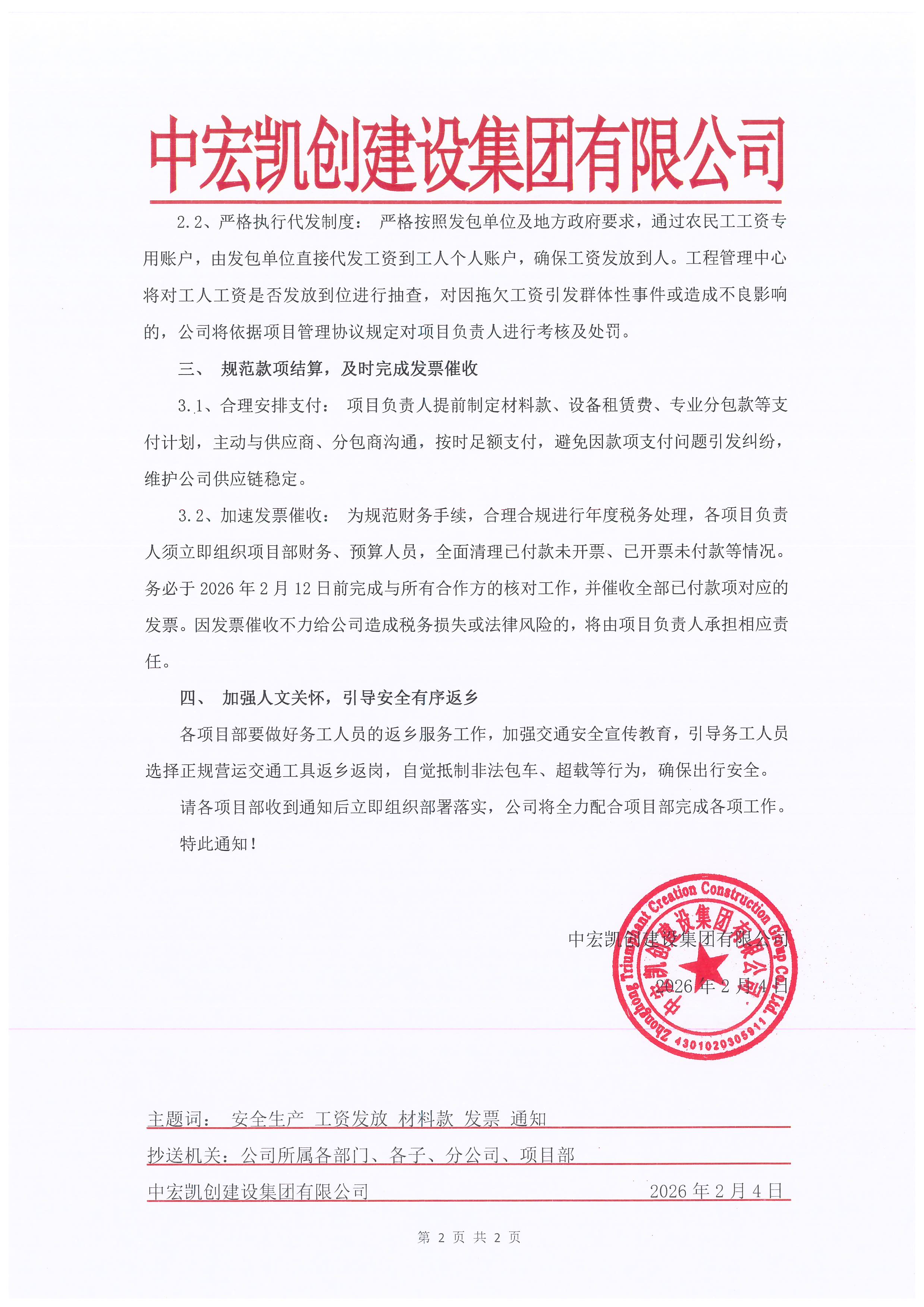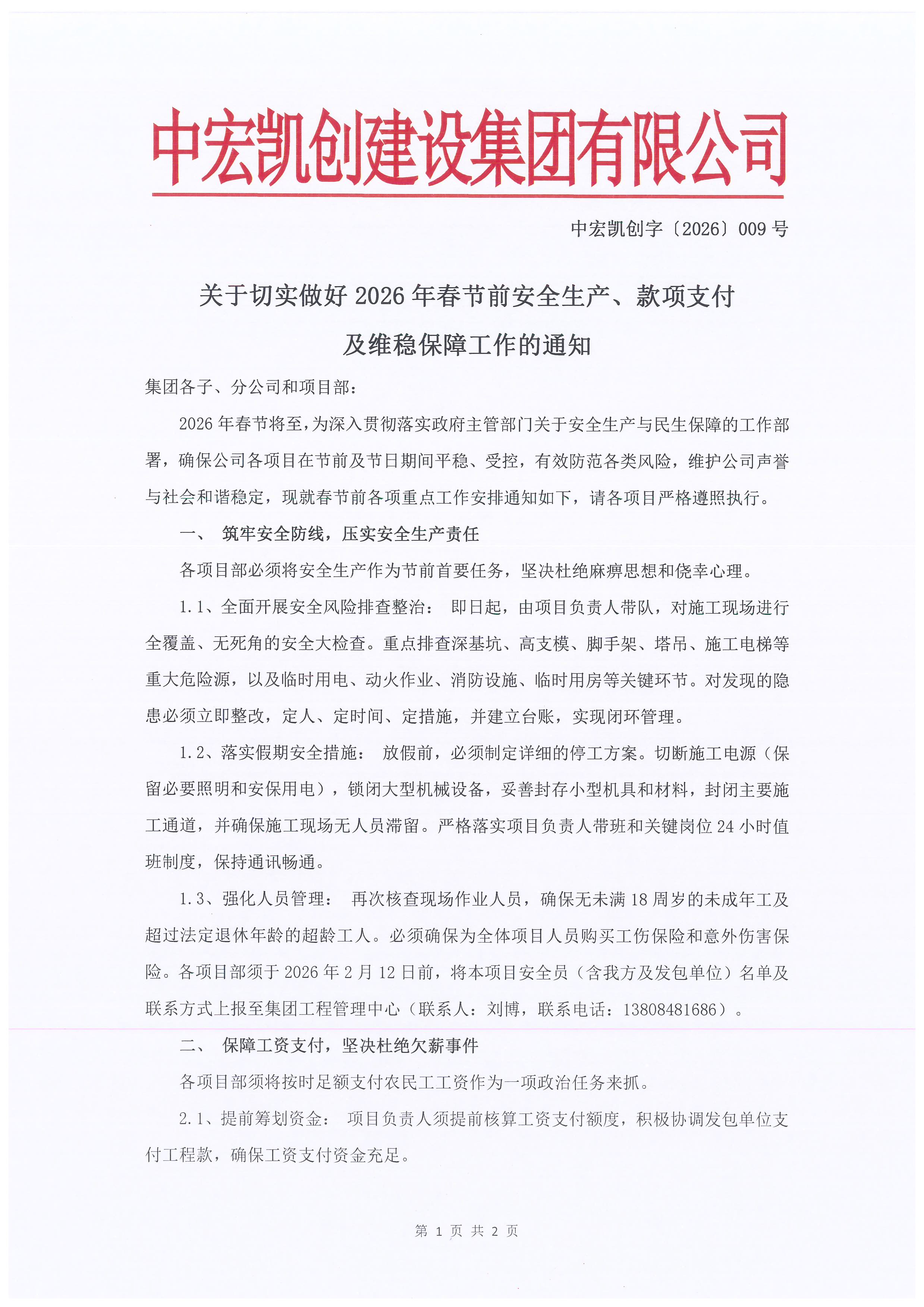 2026年春节将至,为深入贯彻落实政府主管部门关于安全生产与民生保障的工作部署,确保公司各项目在节前及节日期间平稳、受控,有效防范各类风险,维护公司声誉与社会和谐稳定,现就春节前各项重点工作安排通知如下,请各项目严格遵照执行。